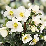 Helleborus x glandorfensisNEW!This variety starts flowering as early as November, kicking off the winter season with its wonderful appearance. The delicate white petals of HGC® Ice N’ Roses® Ivory Blush are perfectly complemented by strong, dark stems, creating a striking contrast. It is ideal as a garden plant or for large containers on terraces, balconies, or at entrances. It prefers semi-shaded locations but also performs well in sunnier spots.