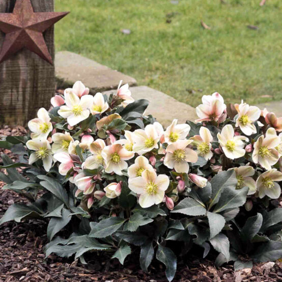 Helleborus x ericsmithiiThe HGC® Malory begins to open its soft pink buds in December, bringing joy to the garden, balcony, or terrace. It keeps on flowering through spring. Thanks to the soft creamy and pink flowers, this variety blends especially harmoniously with companion plants like red-leaved Heuchera, ornamental grasses in copper tones, or Ajuga.